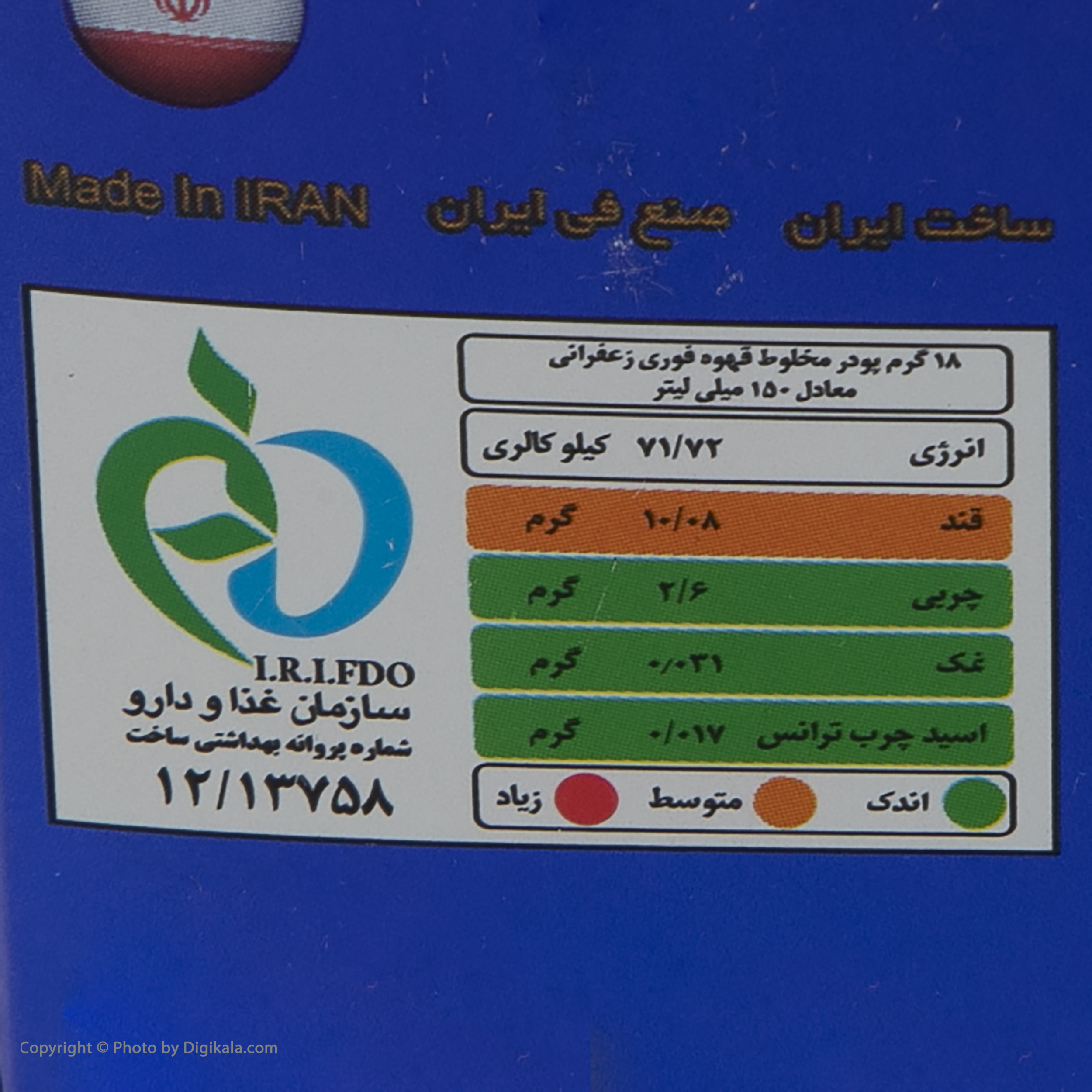 ترکیبات: پودر قهوه فوری، پودر خامه ای کننده غیر لبنی، شکر و سرگل زعفران